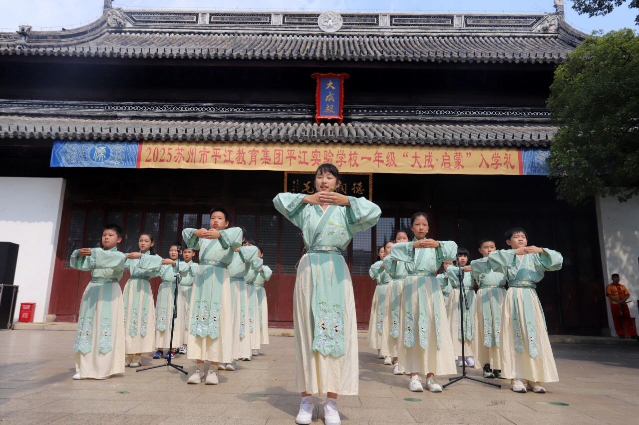 9月28日是孔子诞辰纪念日,苏州市平江实验学校全体一年级新生齐聚在雄伟的大成殿前,在家长和老师的陪伴下,举行2025级“大成·启蒙”入学礼。岁月更迭,始建于明嘉靖二十年的大成殿曾见证了一代又一代莘莘学子积极进取的精神,今天又见证着孩子们勤奋学习、平实做人、追求大成。